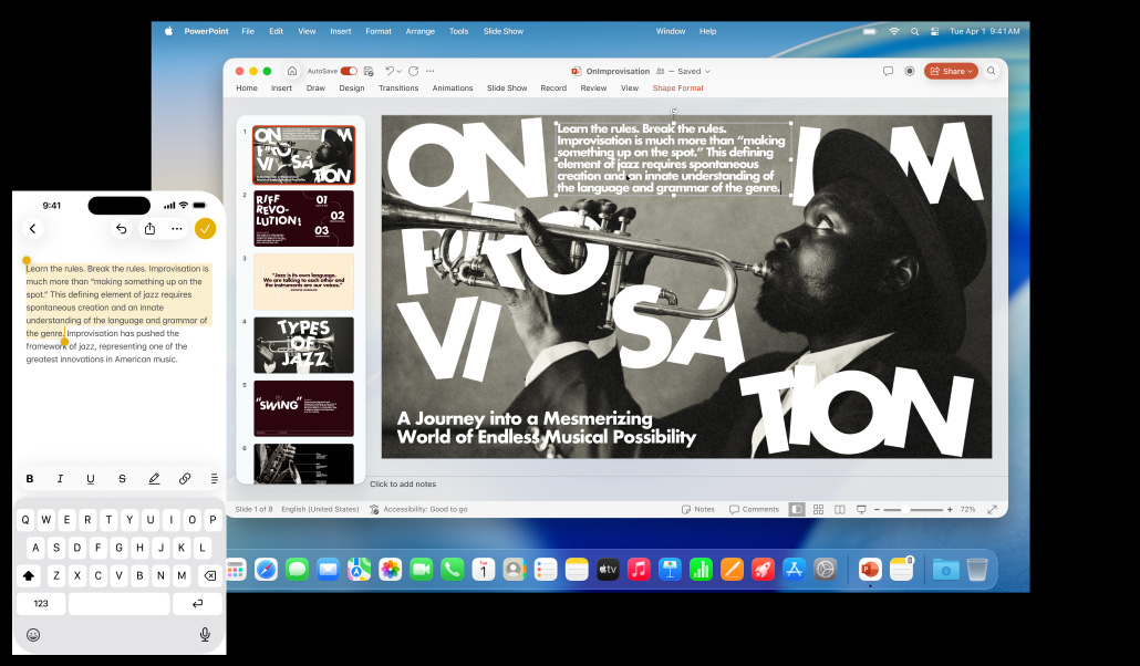 El Mac, el iPhone, el iPad y el Apple Watch ya son increíbles por su cuenta. Pero al usarlos juntos, se lucen mucho más. Gracias a Continuidad, tus dispositivos trabajan en equipo con total fluidez para que puedas acceder a un mundo de funcionalidades espectaculares. Empieza a escribir un email en tu Mac y termínalo en el iPad. Saca una foto en tu iPhone para verla al instante en el Mac. O haz llamadas sin tener que usar el iPhone.1 Todo gracias a Continuidad.