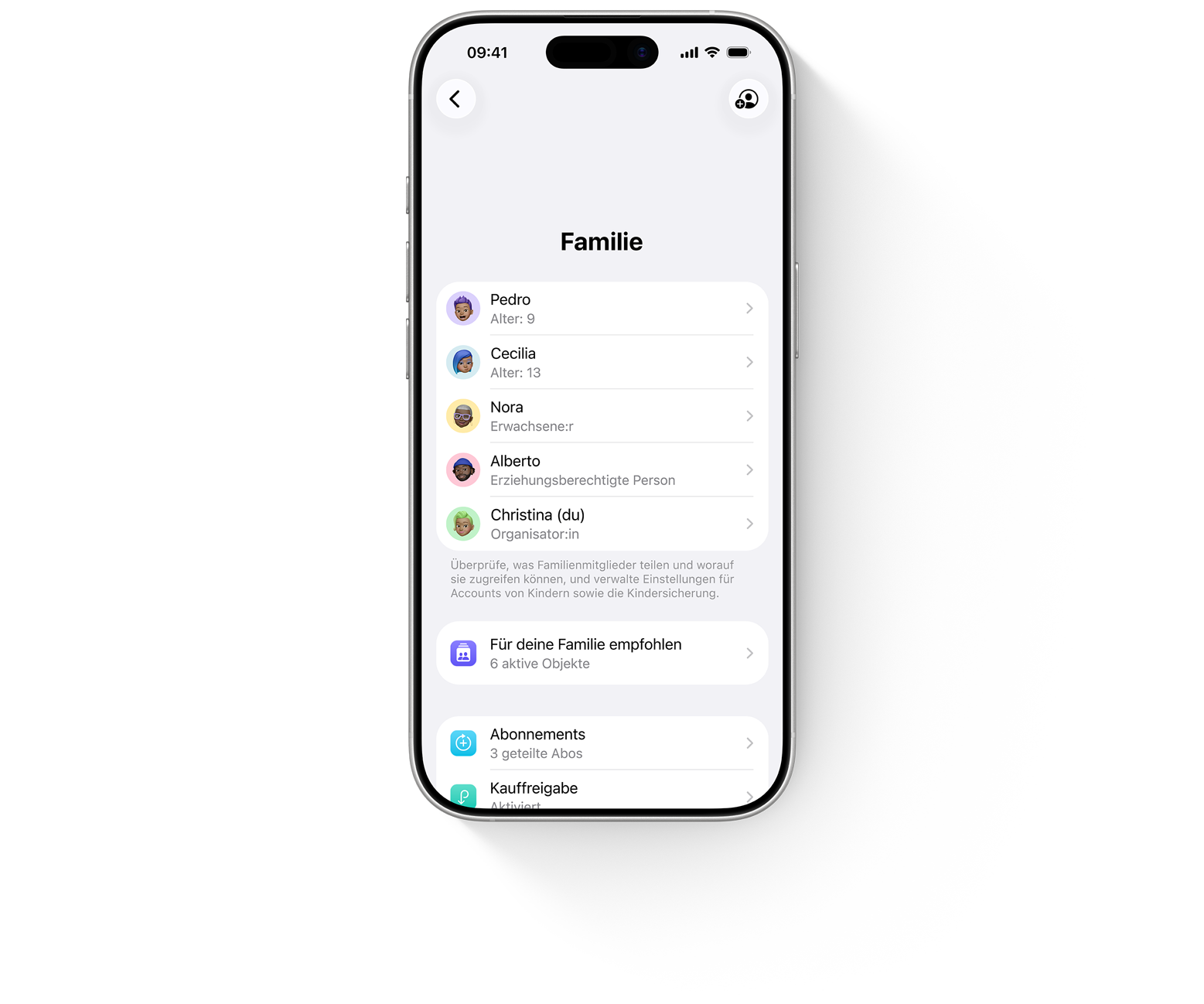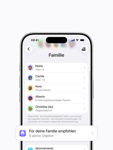 • Du kannst Tipps und Vorschläge erhalten, wie du Features für Familien optimal nutzen kannst. Öffne einfach „Einstellungen“, tippe auf deinen Namen, auf „Familie“ und dann auf „Für deine Familie empfohlen“.