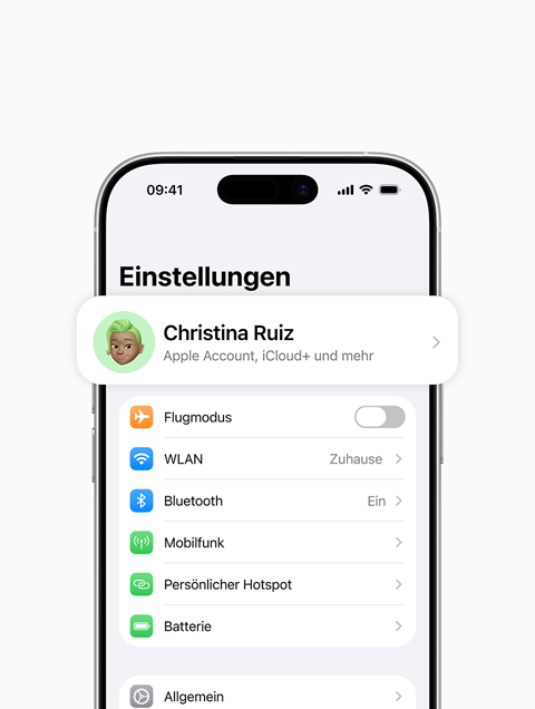 • Du musst deine Gruppe als Familien­organisator:in einrichten und dann andere Mitglieder einladen, ihr beizutreten. Öffne zuerst „Einstellungen“. Tippe dann auf deinen Namen, dann auf „Familie“ und folge den angezeigten Hinweisen, um Familien­mitglieder einzuladen.