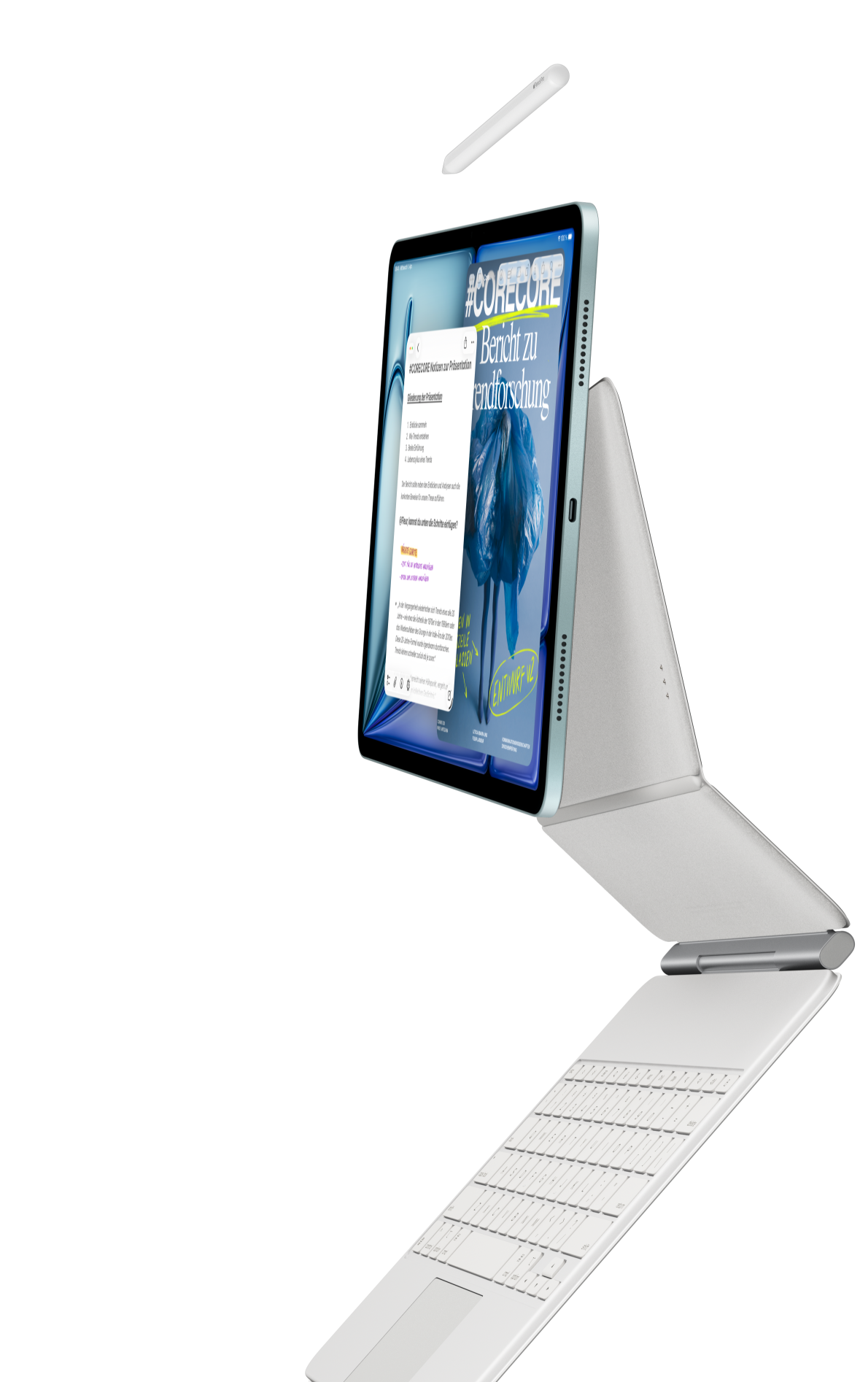 Das Magic Keyboard – erhält­lich in Schwarz oder Weiß – ist der perfekte Begleiter für das iPad Air. Es hat ein schlankes, mobiles Design und ermög­licht angenehmes Tippen. Und auf seinem Track­pad kannst du ganz präzise arbeiten. Die Tastatur hat eine Reihe mit 14 Funktions­tasten, einen USB‑C Anschluss zum Pass‑Through Laden sowie einen Schutz für die Vorder‑ und Rück­seite deines iPad Air. Das frei­schwebende Design lässt sich stufen­los an mehrere Betrachtungs­winkel an­passen und das große Track­pad aus Glas gibt dir neue Möglich­keiten, mit iPadOS zu arbeiten.2