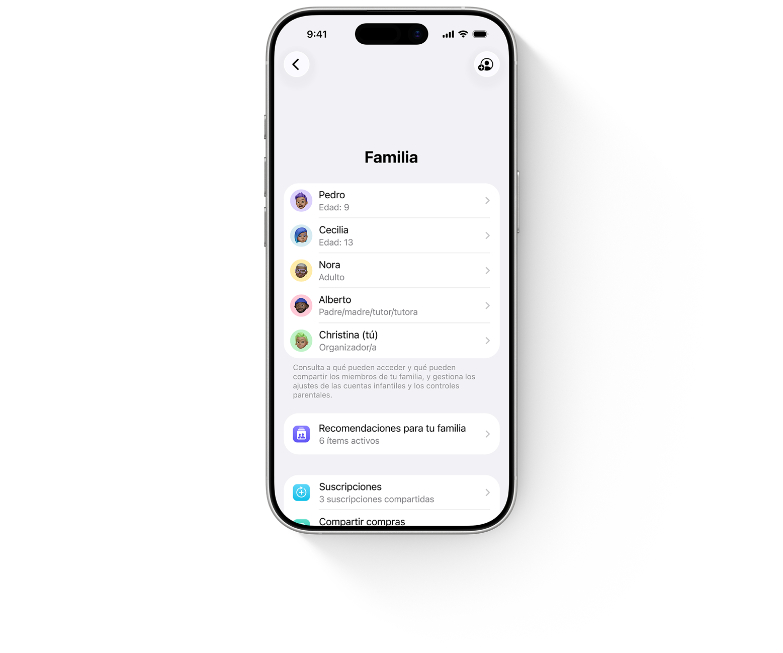• Obtén consejos y sugerencias para sacar el máximo partido a las prestaciones para familias. Abre Ajustes y toca tu nombre, seguido de Familia, y elige Recomendaciones para tu familia.