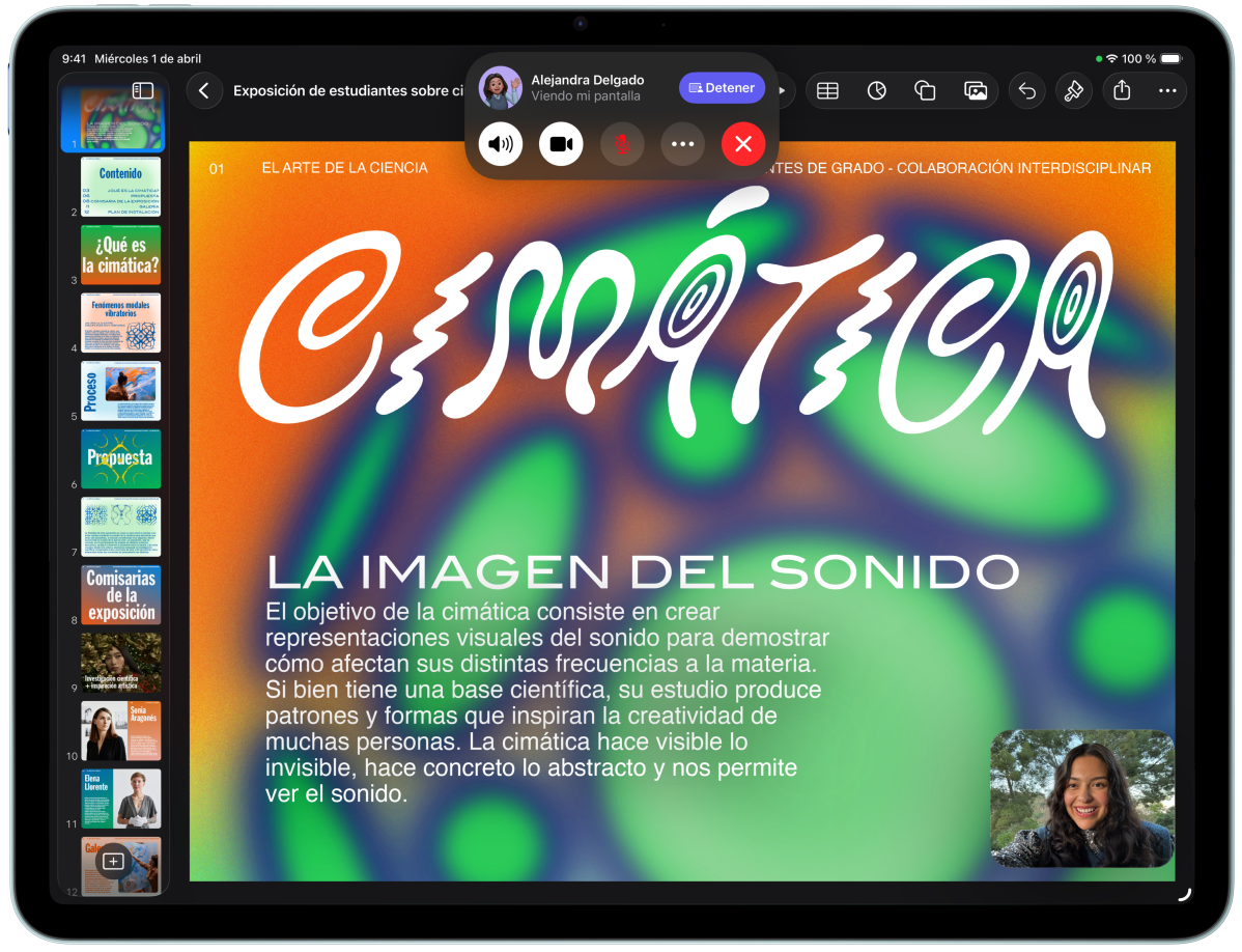 Pad Air, parte delantera exterior, la persona que lo está usando está en FaceTime a la vez que consulta Keynote delante de otro iPad Air, parte exterior trasera