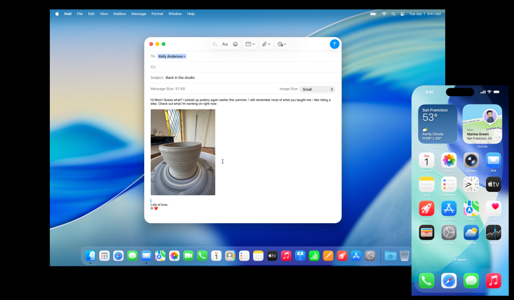 透過相機接續互通功能,你用 iPhone 拍攝的相片,可即時在你的 Mac 上電郵顯示出來;用 iPhone 掃描的收據,可直接在訊息 app 出現,並已自動裁剪和拉直,隨時都可分享出去。相機接續互通功能可與備忘錄、Pages 和 Keynote 等眾多 app 配合使用,令 iPhone 與 Mac 之間的合作,更合拍。相機接續互通功能更為視像通話解鎖不同新功能,例如當你使用 FaceTime 及 Zoom,可利用桌上視角功能,以俯視角度展示自己的工作空間;而在視像通話中,人物置中功能更會隨你移動,讓你時刻保持入鏡。