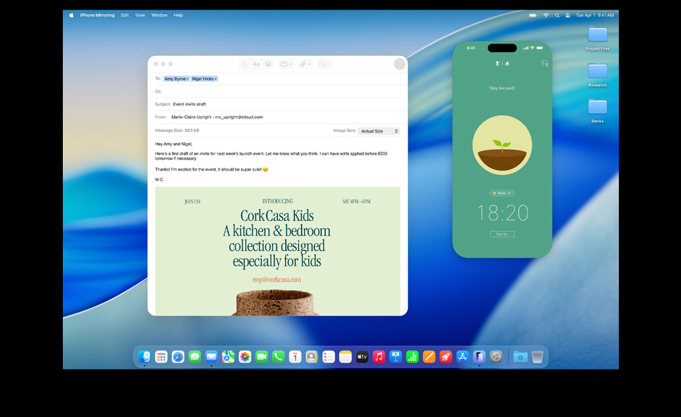 Mac, iPhone, iPad, dan Apple Watch luar biasa saat bekerja sendiri. Dan semakin mengagumkan saat digunakan bersama. Berkat Kontinuitas, perangkat Anda bekerja sama dengan mulus — memungkinkan berbagai fitur yang andal. Mulai email di Mac dan selesaikan di iPad Anda. Ambil foto di iPhone dan lihat foto itu muncul di Mac Anda. Atau lakukan panggilan tanpa menyentuh iPhone Anda.1 Nikmati keajaiban Kontinuitas.