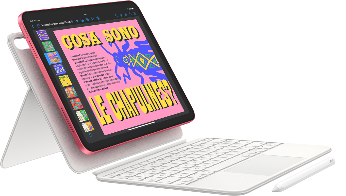 Ti va di fare un disegno o addirittura un dipinto? O vuoi sempli­cemente scrivere? Apple Pencil è lo strumento ideale. Con la Magic Keyboard Folio, invece, puoi comodamente digitare, usare il track­pad e inclinare l’iPad per avere una visione ottimale.2 Ha un design versatile in due pezzi, tutti i tasti che ti servono per le scorciatoie che già conosci, e un ampio track­pad interamente cliccabile. Bella e geniale, no?