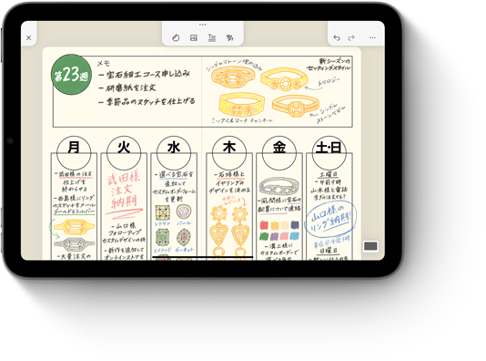Apple Pencilは、絵を描いたり、色を塗ったり、手書きで入力したり、メモを取る時の使い心地に基準を打ち立てました。それは直感的で、精密で、魔法のようです2。ピクセルレベルの精度と低いレイテンシー。傾きを感知するセンサー。パームリジェクションテクノロジー。どのモデルを選んでも、そのすべてを体感できます。さらに、より多くの機能が追加されたApple Pencil Proなら、これまで以上の方法であなたのアイデアを形にできます。