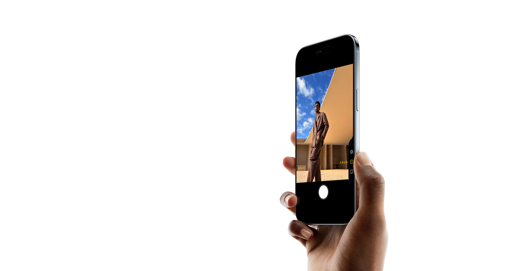 iPhone Air、前面の外観と側面の外観。オールスクリーンのデザイン、上部にDynamic Islandがある。サイドボタン、カメラコントロールボタン