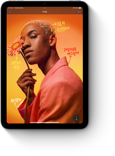Apple Pencil은 그림을 그리고, 손글씨를 쓰고, 필기를 하는 행위가 어떤 느낌으로 이루어져야 하는지에 대한 기준을 제시합니다. 직관적이고, 정밀하면서도 사뭇 신기롭죠.2 픽셀 단위의 정밀함과 극히 짧은 지연 시간, 기울기 감지 기능, 팜리젝션 기능까지 갖췄답니다. Apple Pencil Pro는 여기에 더욱더 많은 기능을 더해 전에 없던 방식으로 당신의 아이디어에 생명을 불어넣을 수 있게 해줍니다.