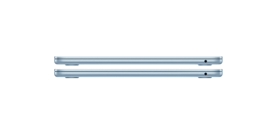 Açık duran iki adet gök mavisi rengi MacBook Air, laptopun ince profiline vurgu yapmak için ok şekli oluşturacak şekilde duruyor